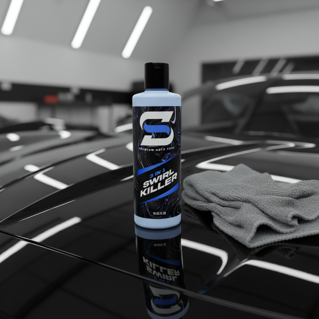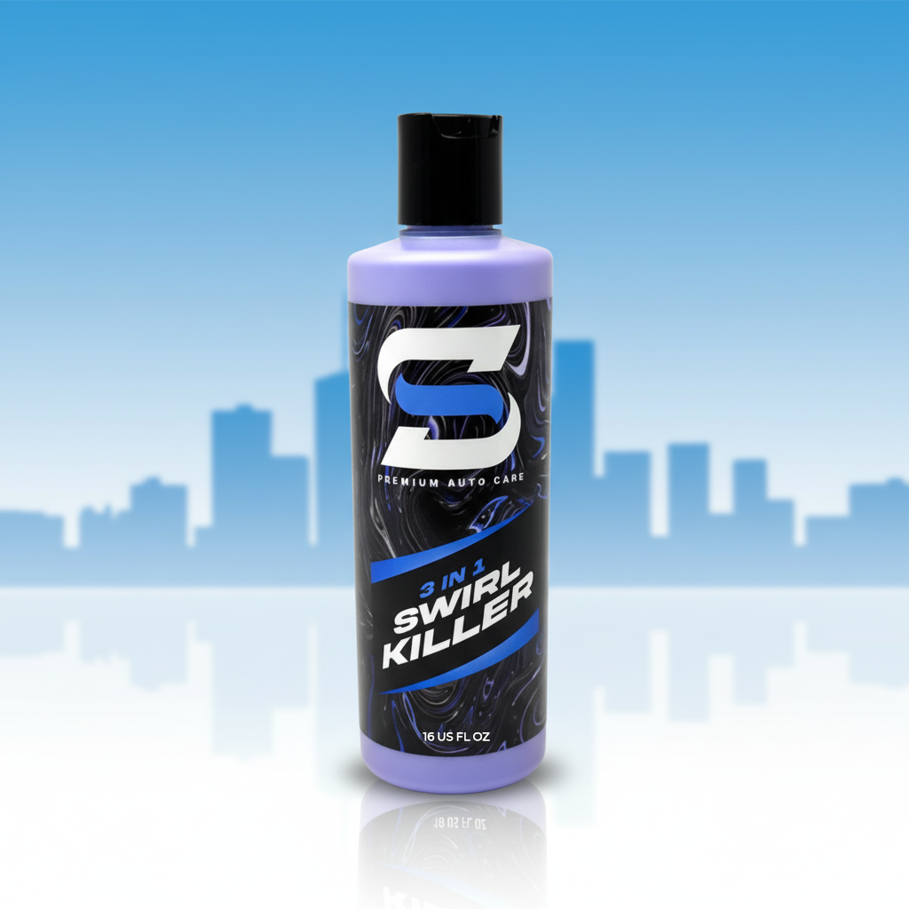 3 in 1 Swirl Killer is an all-in-one polish that removes swirls, light scratches, and oxidation while enhancing gloss and clarity. Filler-free, silicone-free, and safe for all clear coats, it delivers professional results with DA or rotary polishers.
