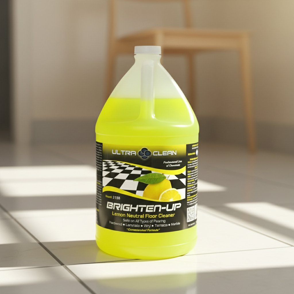 Brighten Up is a lemon-scented, neutral floor cleaner formulated for effective cleaning and deodorizing of all types of flooring surfaces. It’s designed to remove heel marks, dirt, and grime while brightening hard, glossy finishes—no rinsing required. Ideal for hardwood, laminate, vinyl, terrazzo, marble, tile, painted walls, and porcelain.